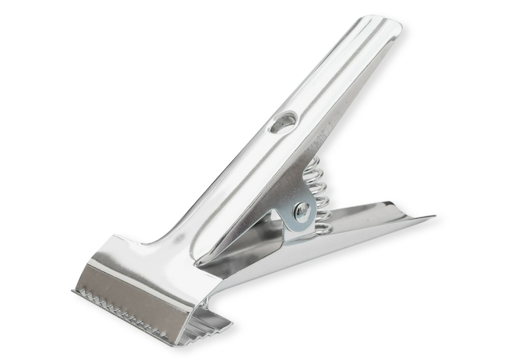 Горизонтальный зажим для кроя, пружинный, с зубчатым краем верхней лапки и ребристой поверхностью нижней лапки. Предназначен для фиксации нескольких слоев тяжелых материалов. Длина (с ручкой): 17 см. Ширина: 6,5 см. Высота настила (макс.): 7,5 см.