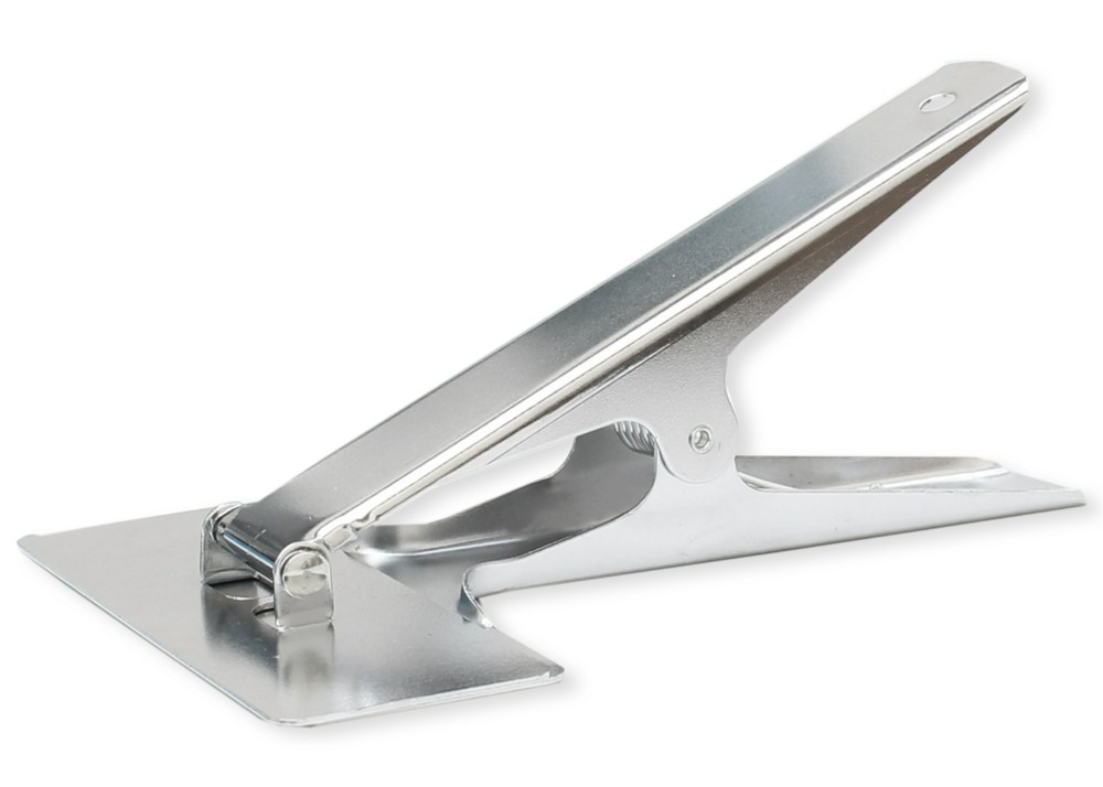 Горизонтальный зажим для кроя, пружинный, с плоскими лапками. Верхняя лапка откидная. Предназначен для фиксации нескольких слоев материала.