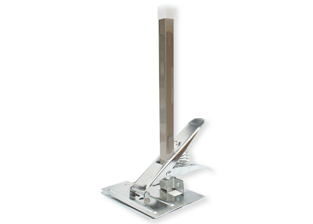 Вертикальный зажим для кроя, верхняя лапка подвижная, откидная, фиксируется на вертикальной стойке с помощью пружинного механизма. Зажим предназначен для фиксации толстых слоев материала.